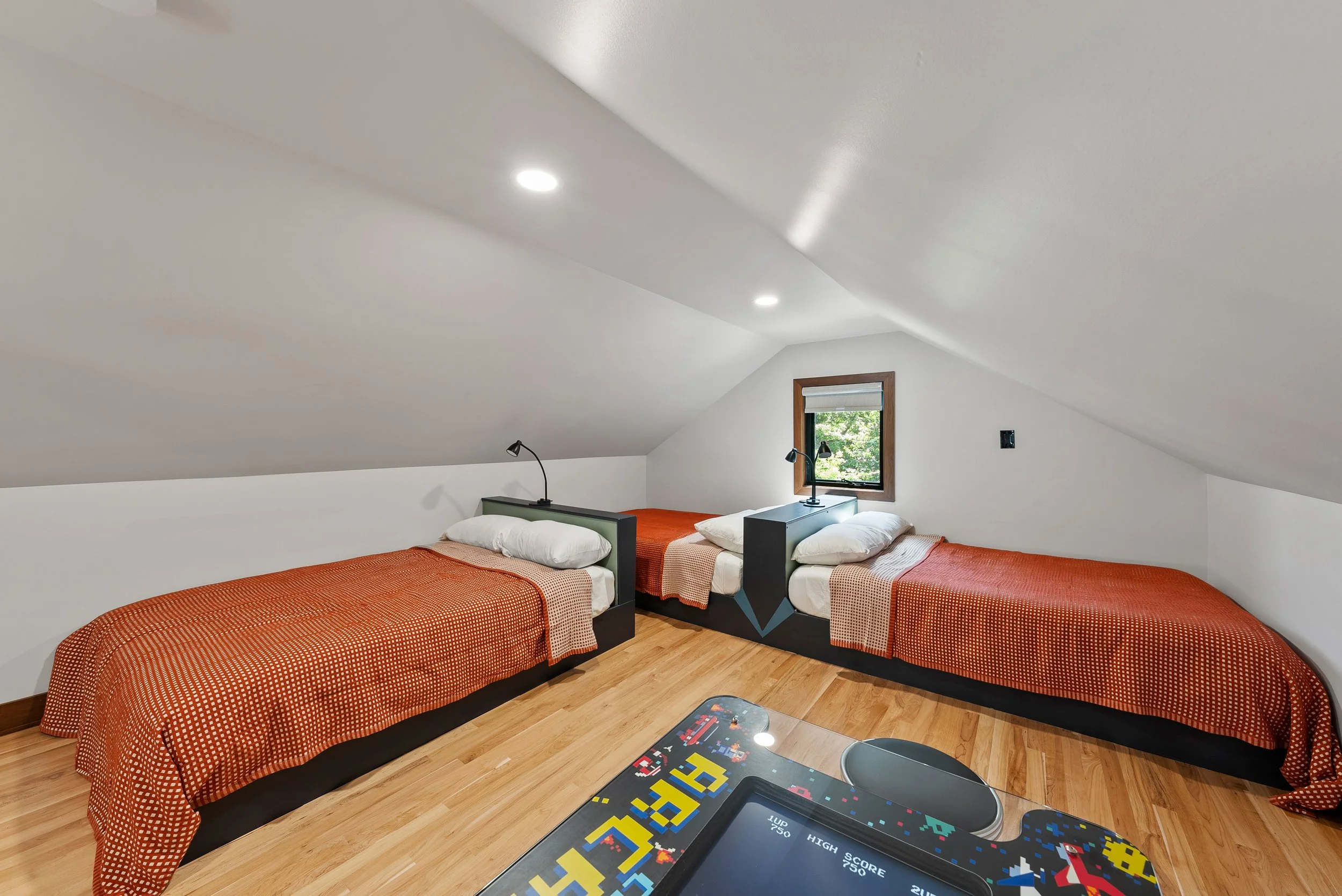 The loft holds 3 full size beds (comfortable for 3 adults or 6 children), a lounge chair, and an old school arcade with 481games!